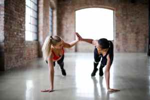 young slender female athletes giving high five to each other while training together in sports club